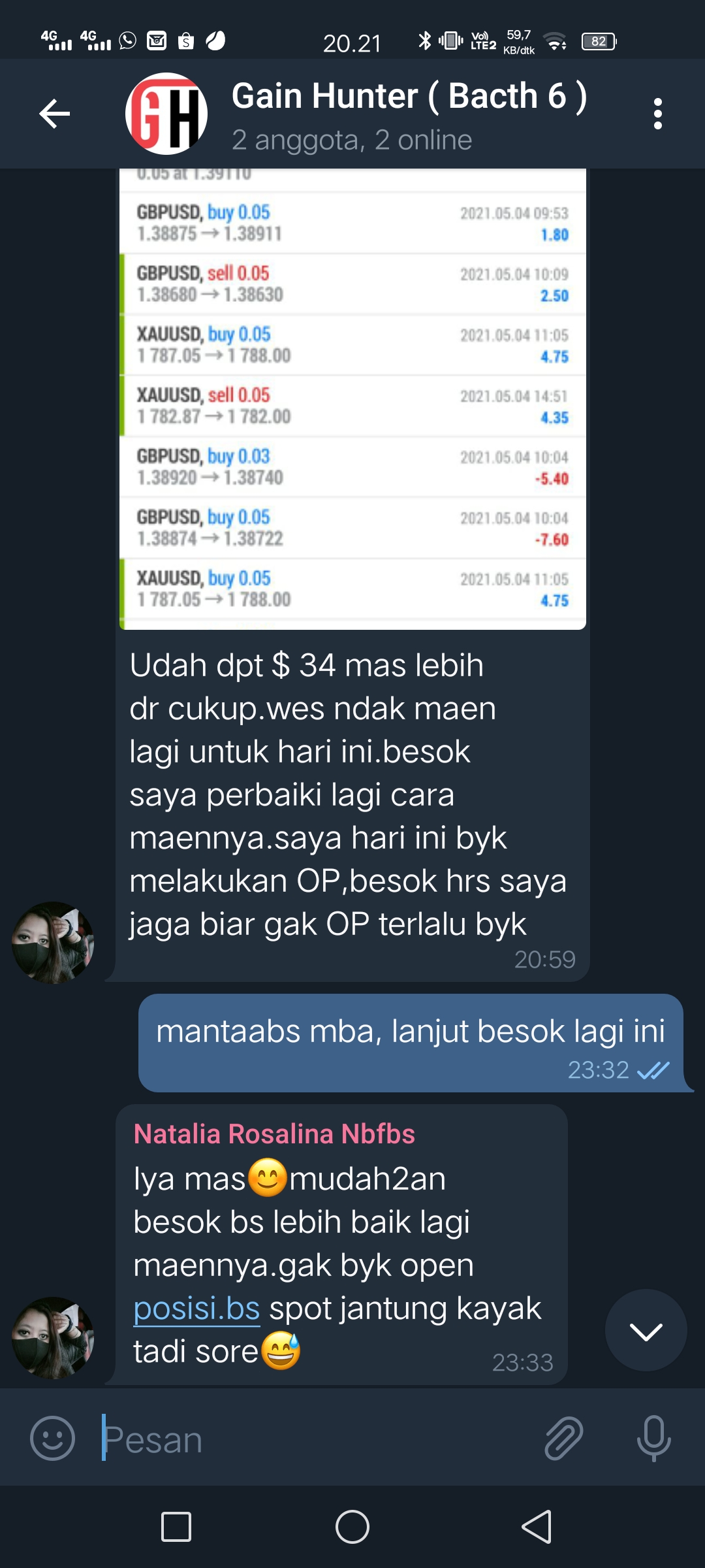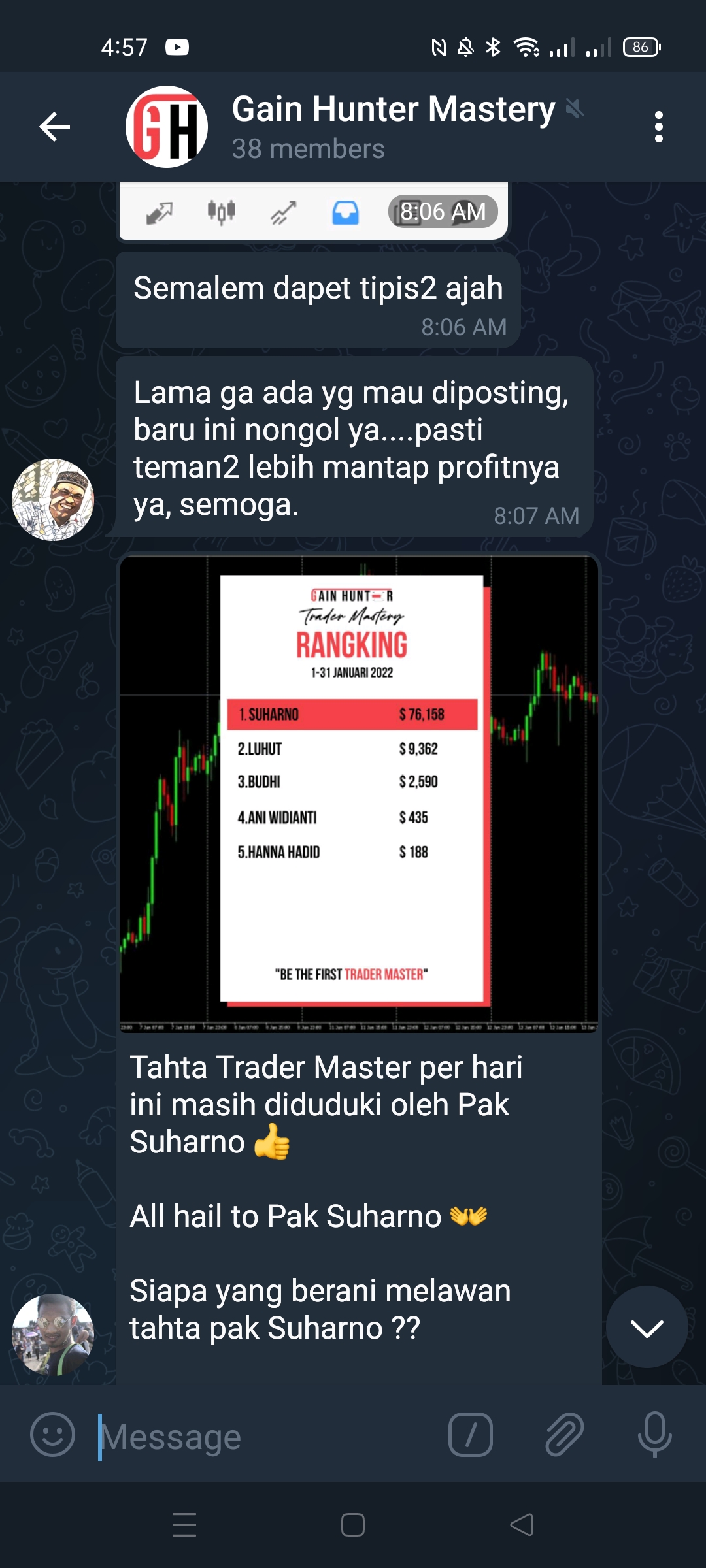Saya liatin group Gain Hunter Mastery yang isinya adalah trader waras semua, bukan trader abal-abal. Ingat, trading forex tanpa ilmu yang sudah teruji adalah awal dari kehancuran finansial.
